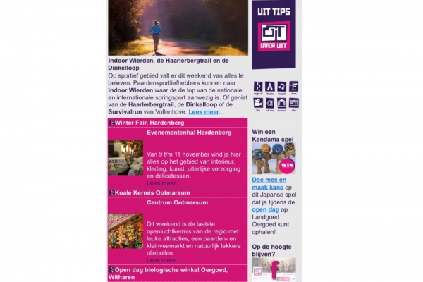 Eén vermelding in de nieuwsbrief van OverUit à €75,-. De nieuwsbrief wordt wekelijks verstuurd op donderdag aan 4.500 personen.